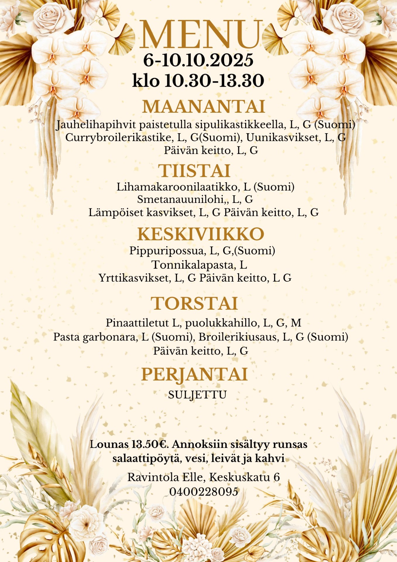 Ravintola Elle tarjoaa herkullista lounasta arkena Mäntsälässä. Ammattitaitoinen kokkimme ja laadukkaat raaka-aineet takaavat makuelämyksiä jokaiseen makuun. Tervetuloa nauttimaan hyvästä ruoasta ja rennosta ilmapiiristä!