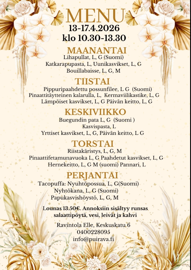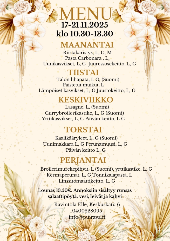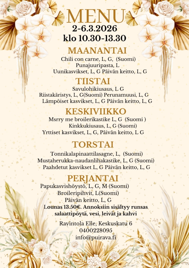 Ravintola Elle tarjoaa herkullista lounasta arkena Mäntsälässä. Ammattitaitoinen kokkimme ja laadukkaat raaka-aineet takaavat makuelämyksiä jokaiseen makuun. Tervetuloa nauttimaan hyvästä ruoasta ja rennosta ilmapiiristä!